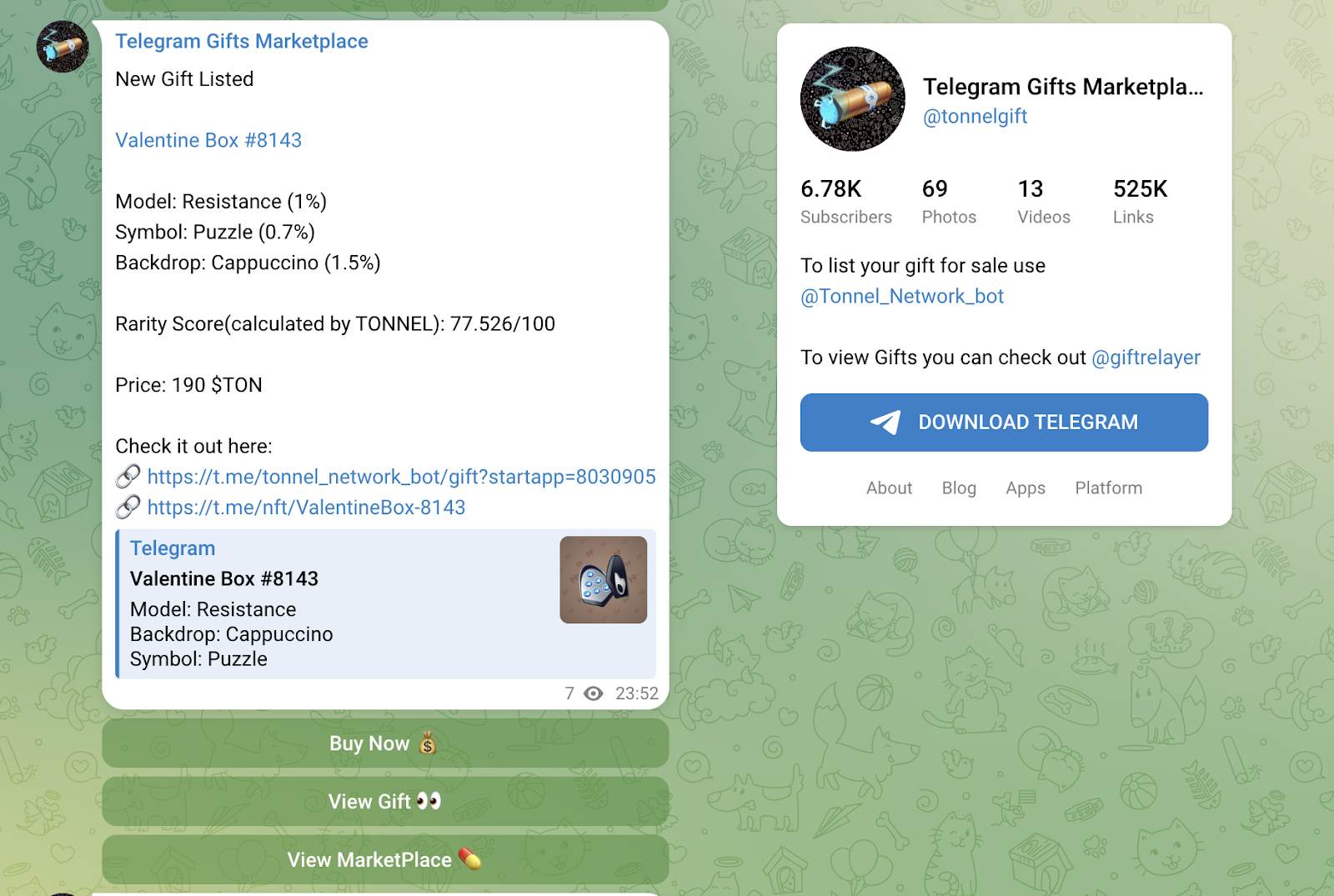 По публичной инструкции торговля идёт через бота-маркетплейс: пользователь заходит в @Tonnel_Network_bot, привязывает кошелек TON/JETTON (или использует Telegram Stars, в зависимости от режима), делает депозит, выбирает подарок из каталога, нажимает Buy и подтверждает переводы. Получение подарков часто происходит через @Giftrelayer, который фактически выполняет выдачу/перевод купленного предмета в Телеграмм. При этом, некоторые операции требуют предварительного депозита на адрес бота, а не эскроу между пользователями. Также авторы заявляют и о возможности апгрейда подарков. Это создает вторичный рынок и мотивирует спекуляцию. Такие механики усиливают волатильность и делают краткосрочные движения значимыми.