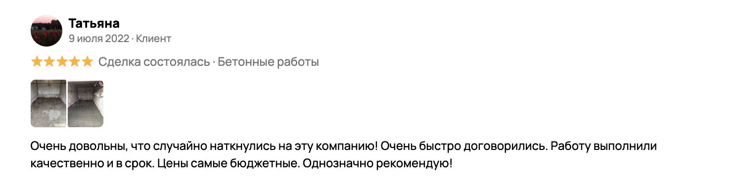 Если говорить про основную деятельность компании — строительные работы, можно найти единственный отзыв о них на том же «Авито». Там женщина по имени Татьяна написала, что осталась довольна качеством. На фото представлена стяжка, сделанная в гараже или сарае. Вряд ли это те масштабы, которые позволяют не думать о безопасности вложенных 300+ тыс.
