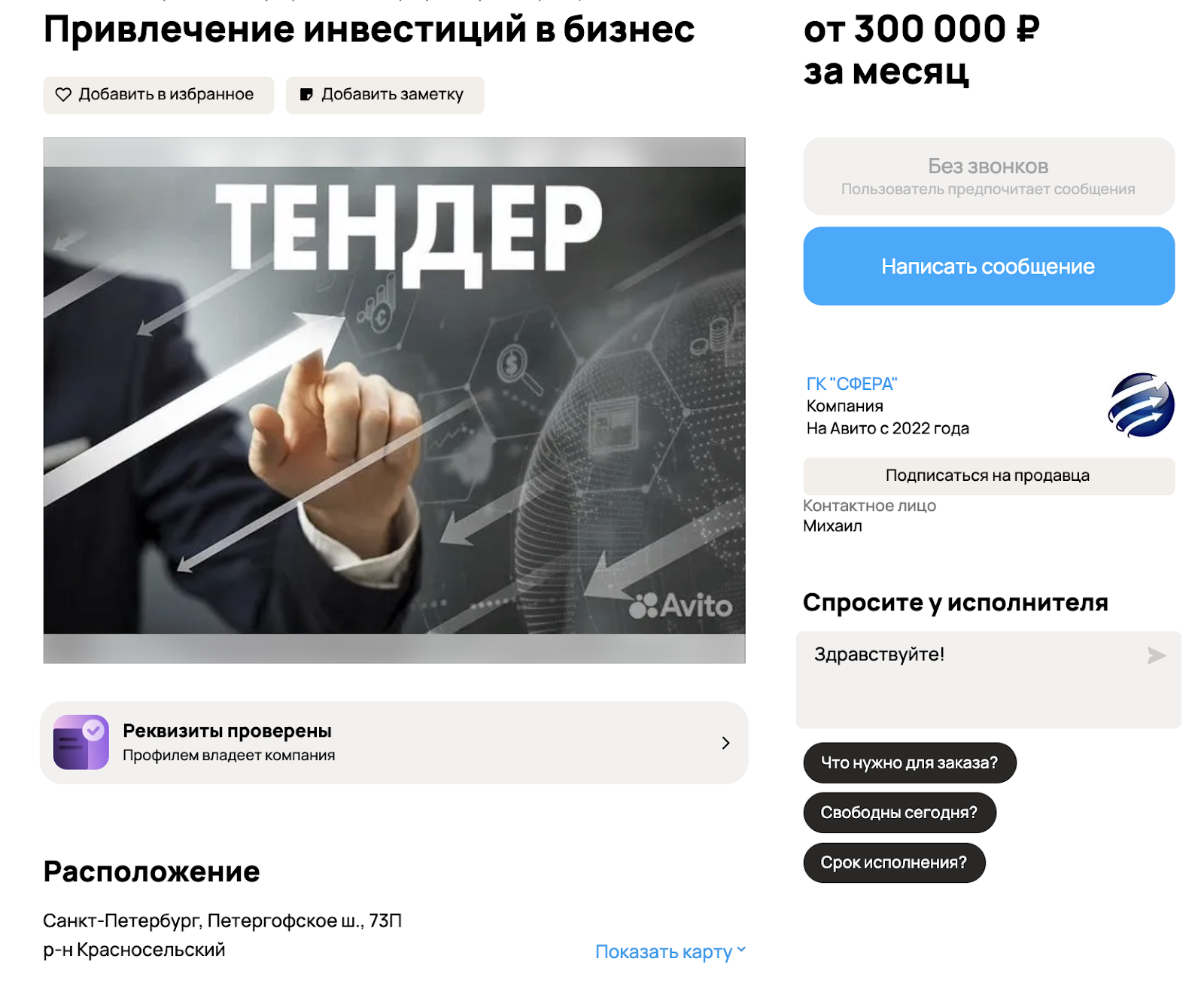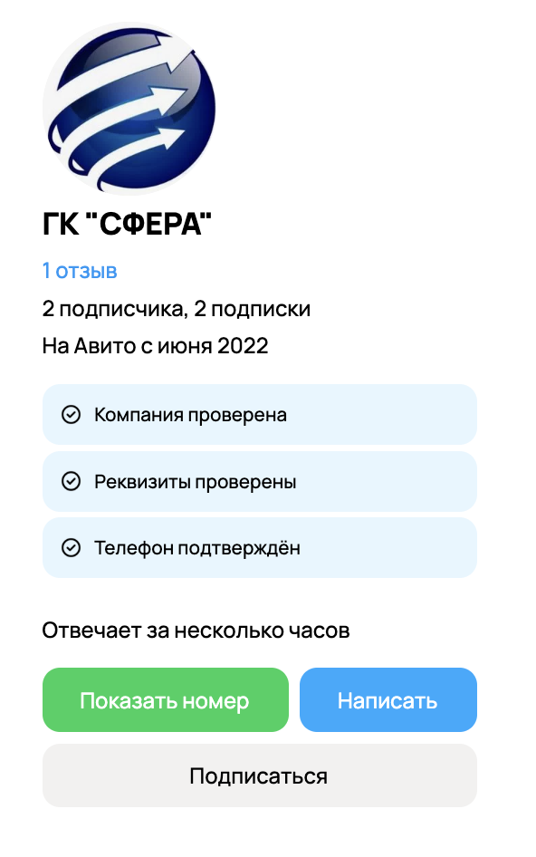 Перед тем как искать отзывы об инвестициях в ГК «Сфера» в СПб, нужно изучить саму компанию, которую организаторы предлагают финансировать. На сайте объявлений «Авито» она зарегистрирована с июня 2022 года. Модераторы проверили предоставленные реквизиты и телефон. Но это не говорит о том, что они изучали деятельность конторы на предмет скама.