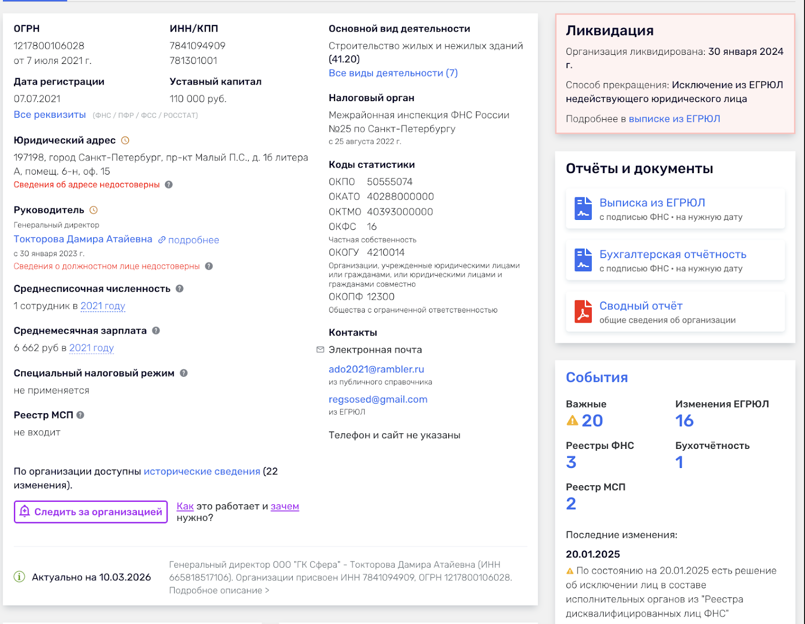 Даже беглый взгляд на карточку субъекта в «Руспрофиль» позволил выявить много «красных флагов»: