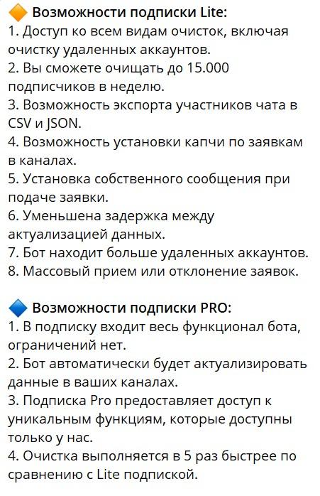 Бот платный. Есть два тарифа – «Лайт» и «ПРО». Они отличаются набором функций. «Лайт» можно купить за цену от 1 010 до 6 790 рублей в зависимости от срока действия подписки, а «ПРО» – от 1 100 до 7 390 рублей. Оплата принимается в криптовалюте и телеграм-звездах.