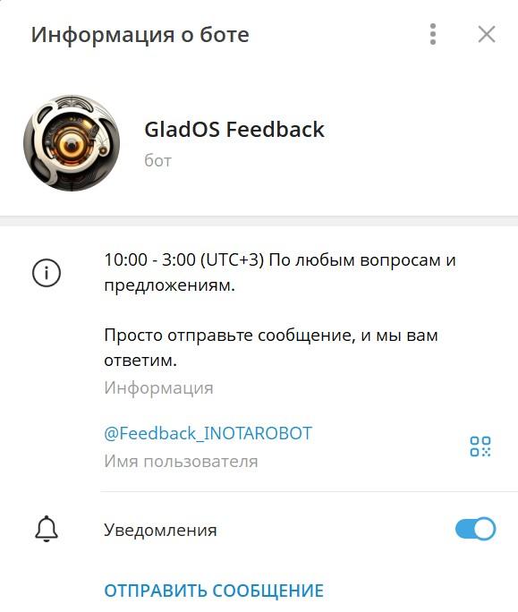 Также у разработчика есть второй бот – GladOS Feedback (Feedback INOTAROBOT), который создан для того, чтобы пользователи могли задавать вопросы по работе основного бота и вносить свои предложения по улучшению качества его функций.