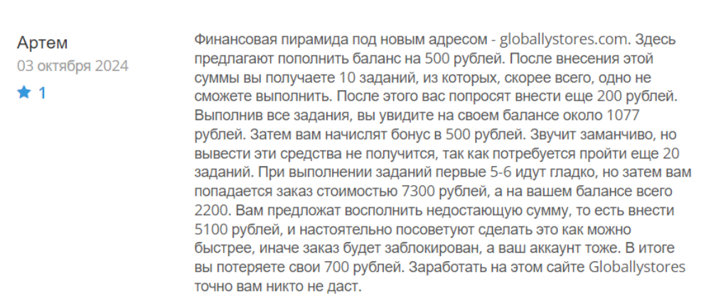 В сети мало откликов о работе организации. Однако мы обнаружили оценку клиента, который плохо отозвался о проекте. Пользователю предлагают вносить все больше средств на свой внутренний счет для выполнения дорогостоящих заказов. Если юзер не пополнит счет, то аккаунт будет якобы заблокирован. В итоге клиент не получает никакой выгоды и остается ни с чем. Данный отзыв подрывает доверие к «Глобаллсторис».