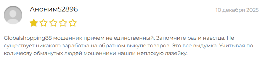 Как сообщают некоторые отзывы, Globalshopping88 com – пирамида и скам-проект, созданный для обмана людей. Заработать на проекте не получится, поскольку авторы занимаются мошенничеством и все их предложения на сайте это просто выдумка.