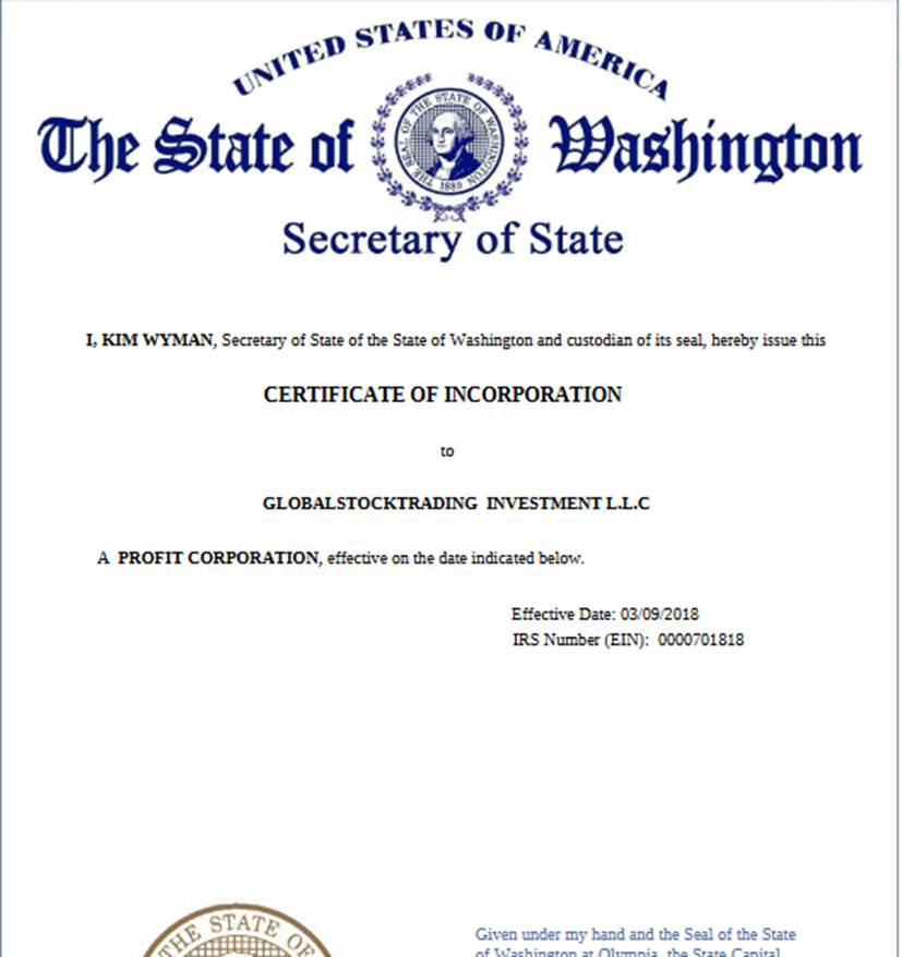 Инвестиционная платформа «Глобал Сток Трейдинг» работает с 2018 года. Об этом свидетельствует сертификат о регистрации компании в штате Вашингтон. Данного документа нет ни в одной официальной базе данных. Этот факт говорит о том, что сервис оказывает услуги без финансовой лицензии, не регулируется государственными органами.