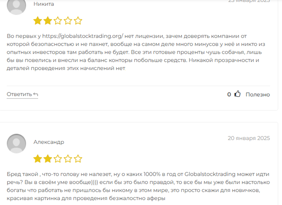 На сайте Globalstocktrading Org можно ознакомиться с положительными отзывами клиентов. Идентичные посты встречаются и у клонов проекта, поэтому им не стоит доверять.