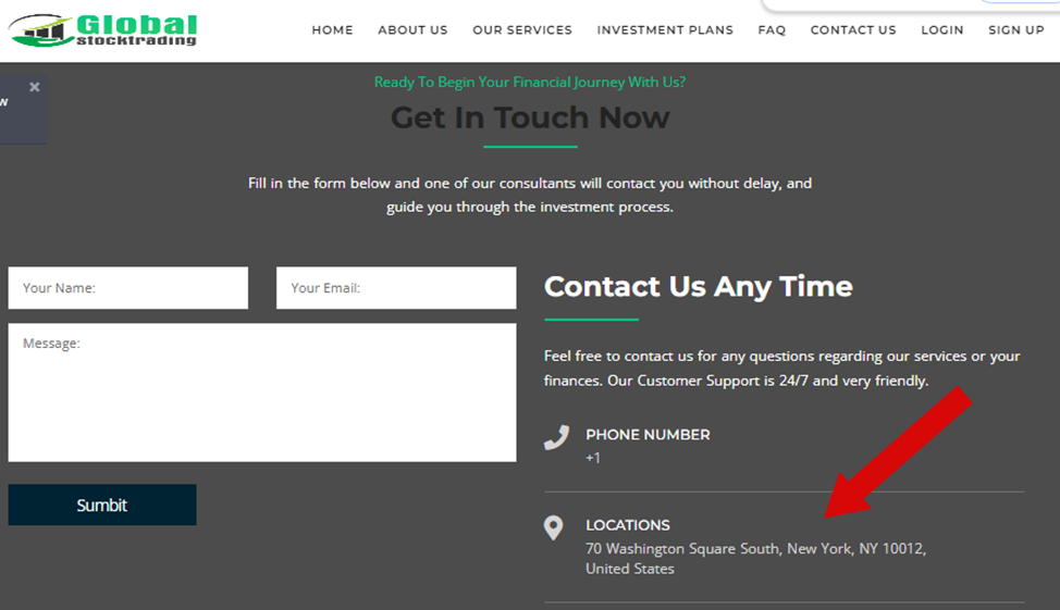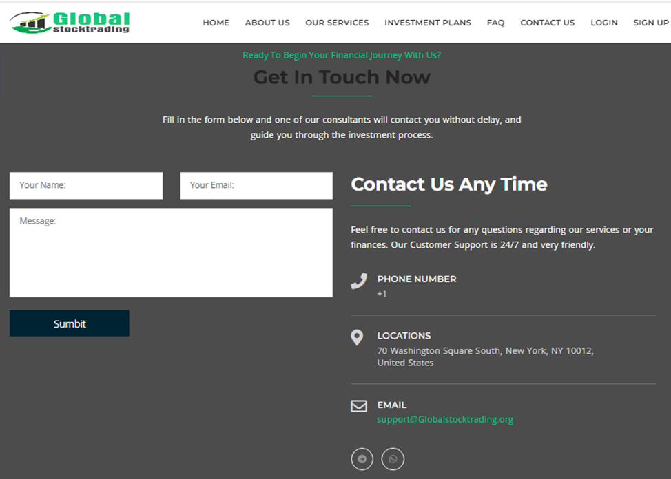 На сайте «Глобал Сток Трейдинг» предусмотрен раздел «Контакты», однако здесь заполнены не все пункты. Например шаблоном предусмотрены телеграмм-канал, номер телефона и WhatsApp-чат. Но разработчики платформы не утруждали себя созданием этих информационных ресурсов. Написать в службу поддержки предлагается с помощью онлайн-формы или на адрес электронной почты Support Globalstocktrading Org.
