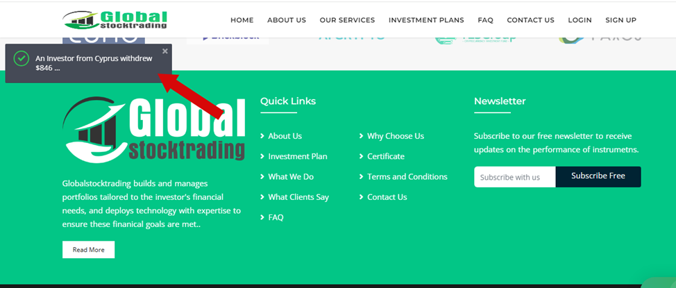 На сайте Globalstocktrading Org регулярно появляются всплывающие окна, оповещающие посетителя про успешные вводы и выплаты системы. Но предлагаемая информация не имеет отношения к действительности. После анализа отзывов клиентов «ГлобалСтокТрейдинг» становится понятно, что ни один из них не смог вернуть деньги.
