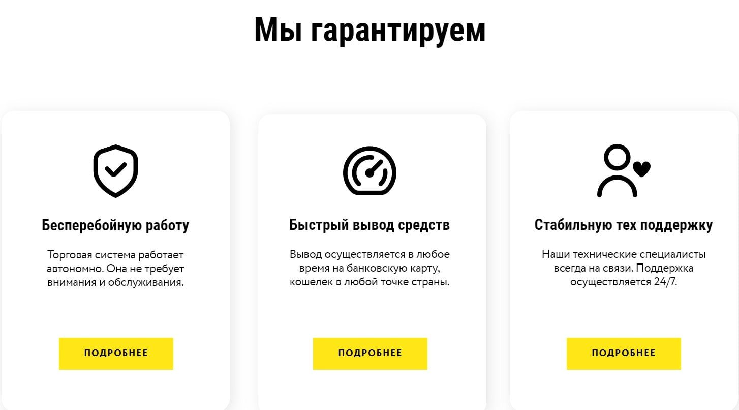 На официальном сайте указано, что GOLDEN TRADING BOT полностью автоматизирован. Процентная ставка достаточно высокая, как уже говорилось выше. И это является главным признаком того, что GOLDEN TRADING BOT является мошеннической схемой. Практически всегда обещания быстрого и гарантированного высокого заработка — это афера, рассчитанная на доверчивых клиентов. Любой опытный трейдер знает, что просадки при торговле бывают даже у самых лучших инструментов, и поэтому нельзя гарантировать получение профита сто процентов.