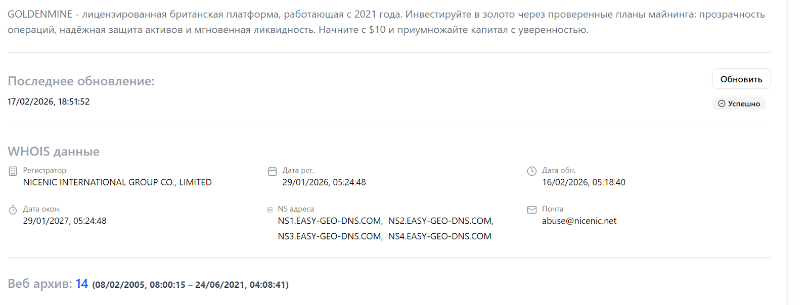 Отсутствуют также подтверждения наличия инфраструктуры или доказательств владения золотыми активами. Домен сайта крайне молодой, а сама компания в реестре связана с деятельностью по управлению недвижимостью.