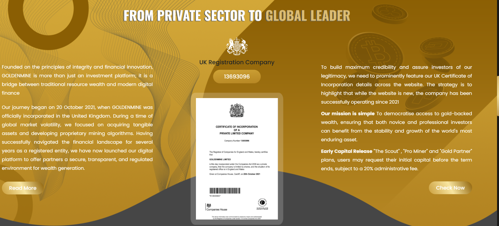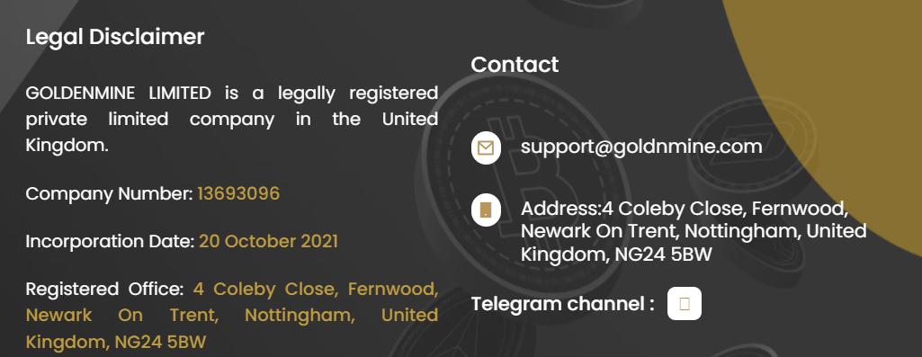 Регистрация компании Goldnmine Limited произошла в октябре 2021 года в Великобритании. На сайте указывается электронная почта support goldnmine com. Домен goldnmine com был зарегистрирован в январе 2026 года. Также на сайте упоминается тг-канал Goldnminecom.