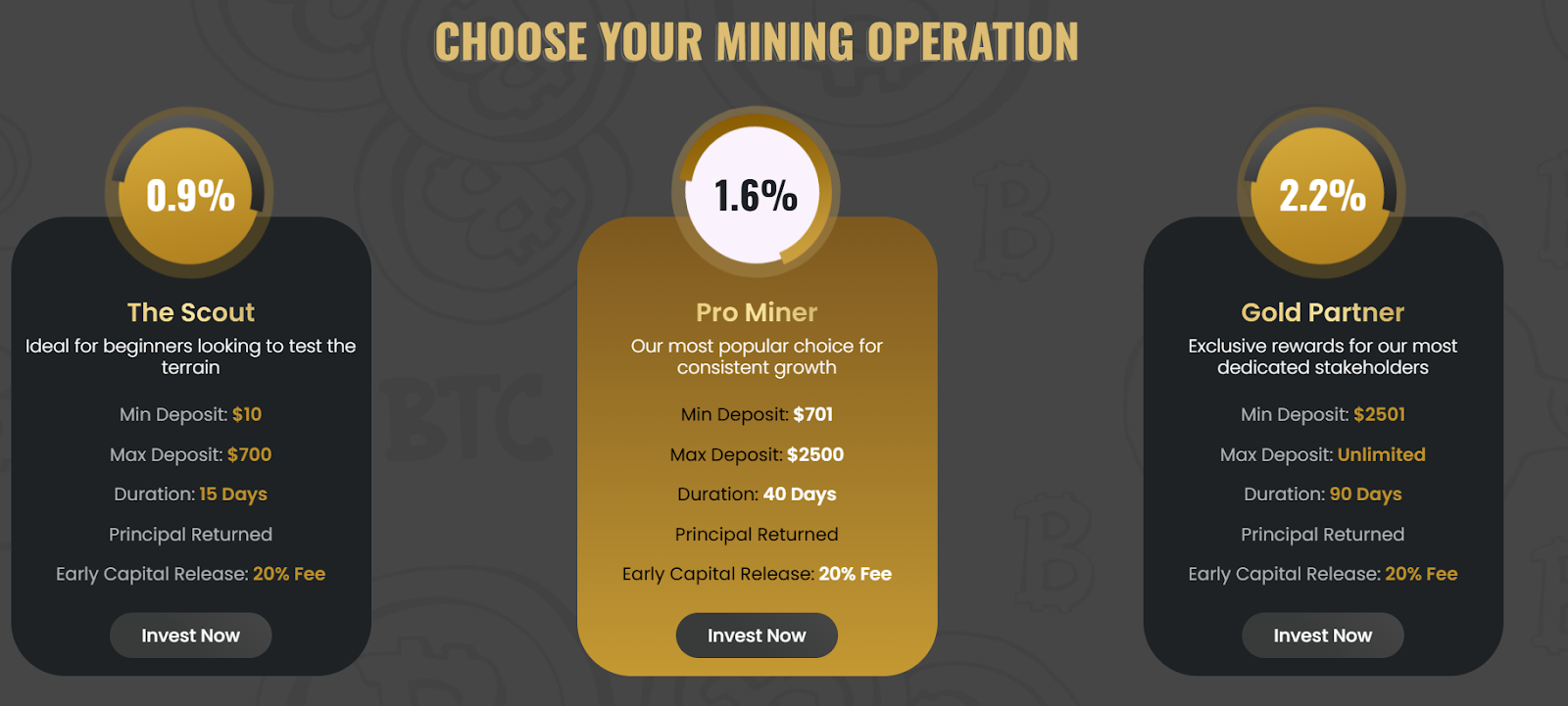 Goldnmine Limited предлагает три плана майнинговых операций. Они позволяют размещать средства для получения ежедневной прибыли с возвратом основной суммы.