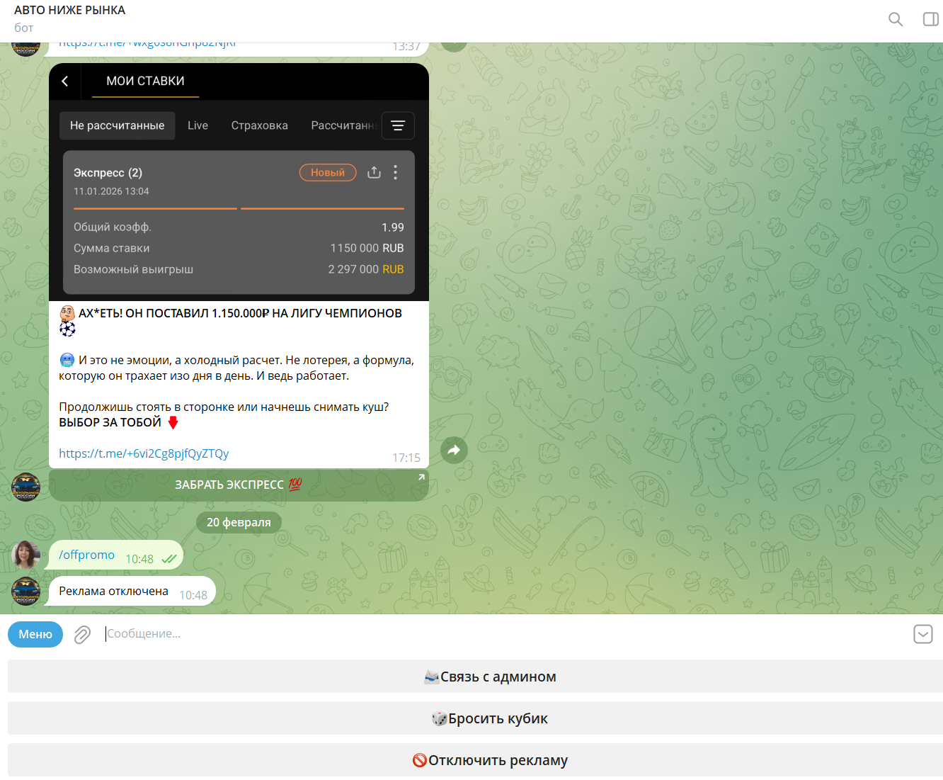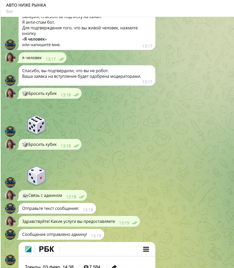 Бот Goodsalecarsbot открывается по ссылке, и реагирует на команду «Старт». В нем есть функция анти-спам. Чтобы подтвердить, что вы не робот, надо написать «Я человек». После этого открывается меню с тремя функциями: бросить кубик – своеобразное развлечение, написать админу и отключить рекламу, последнее можно сделать абсолютно бесплатно.