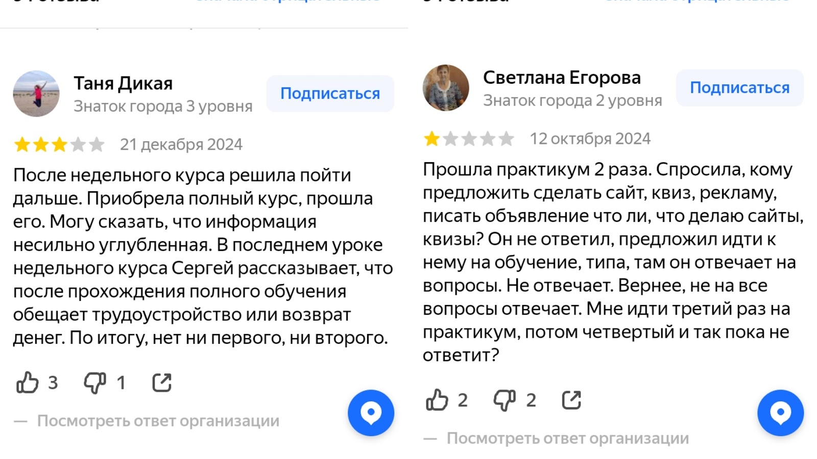 По словам пользователей, трудоустроиться после курса не получается, как и вернуть деньги за обучение. Помимо этого, есть комментарии о том, что наставник игнорирует сообщения учеников и просит проходить новые практикумы.