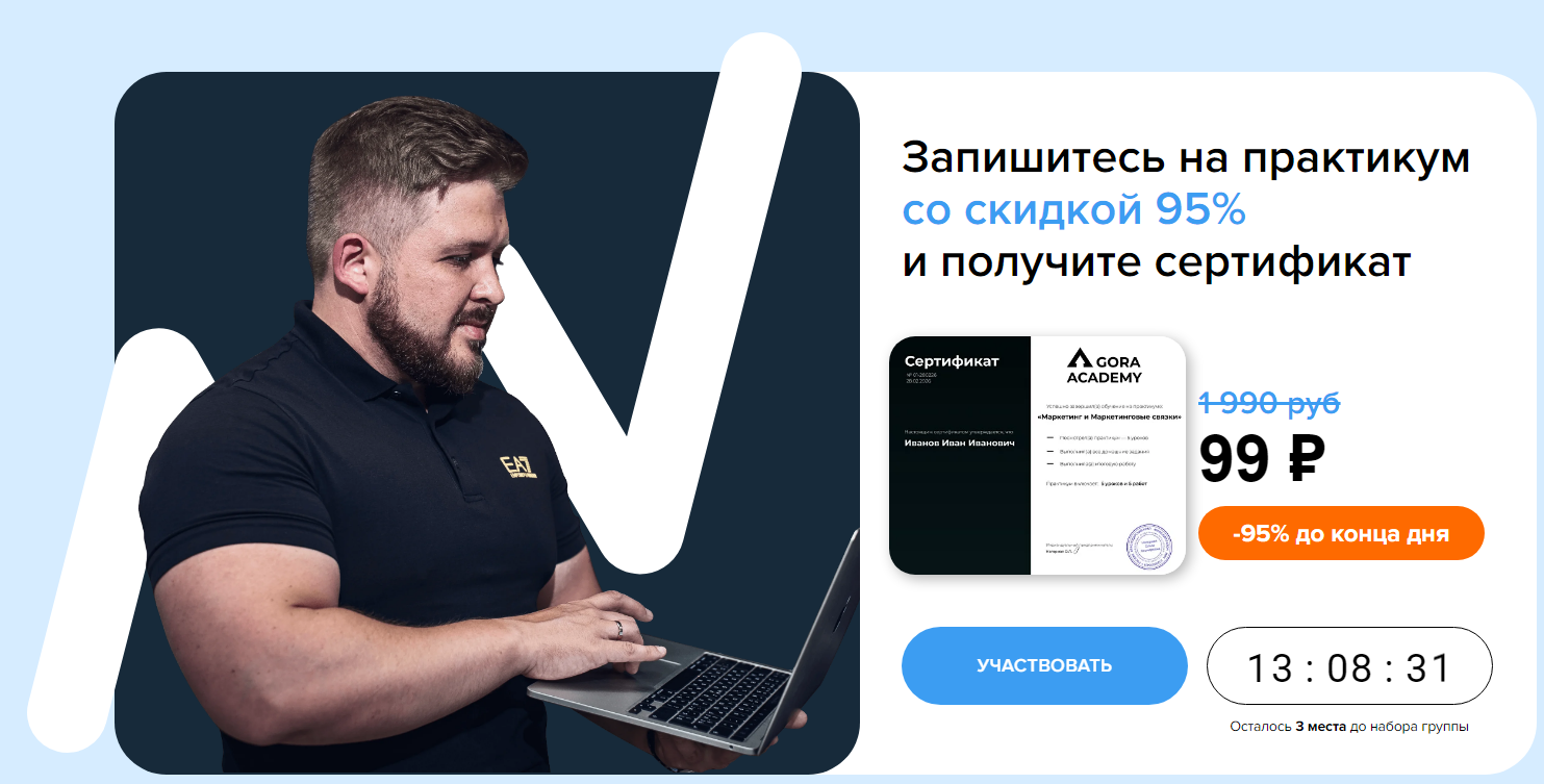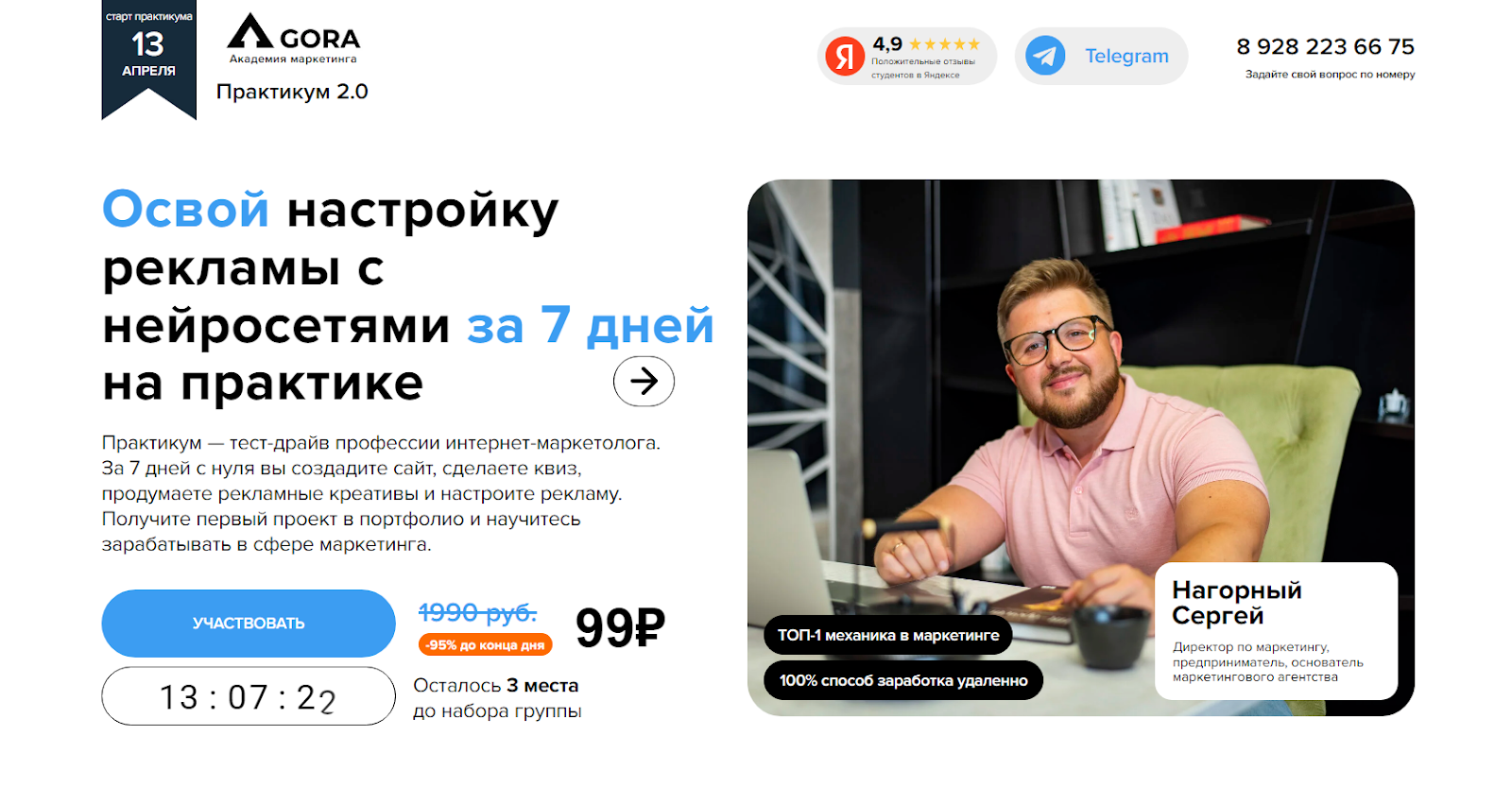 Пользователям предоставлен практикум по профессии интернет-маркетолога. По словам автора, он длится 7 дней, и за этот период времени ученики смогут с нуля создать сайт, квиз, рекламу, получить проект. Цена участия составляет 99 рублей. Для участия необходимо заполнить на сайте строки с именем, почтой и телефоном. После внесения оплаты юзеру отправят ссылку на чат с уроками, а также предоставляет возможность общаться с кураторами и другими пользователями.
