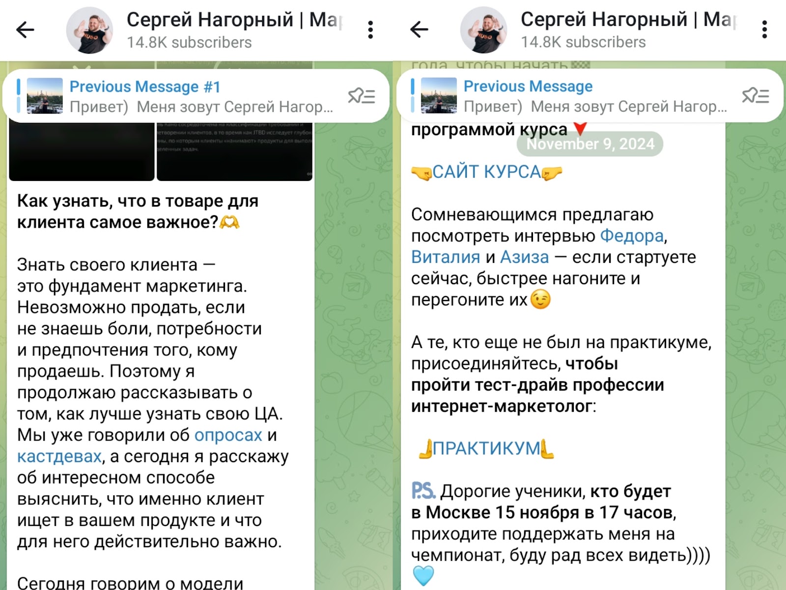 В сообществе размещаются гайды и статьи на тему маркетинга, предоставляются новости, касательно искусственного интеллекта. Кроме того, владелец блога делится опытом работы в области маркетинга, публикует информацию о курсах. В отдельных категориях пользователи могут изучить кейсы Академии Гора, отзывы про курсы, которые предлагает маркетолог Сергей Нагорный, и другое. Новые посты на канале появляются часто.