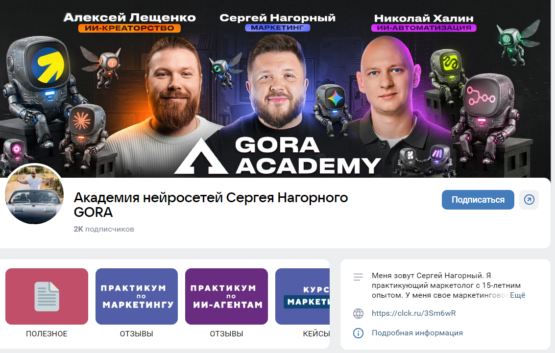 Группа ВК Академия Нейросетей Сергея Нагорного функционирует с 2023 года, и на нее подписано 2k человек.