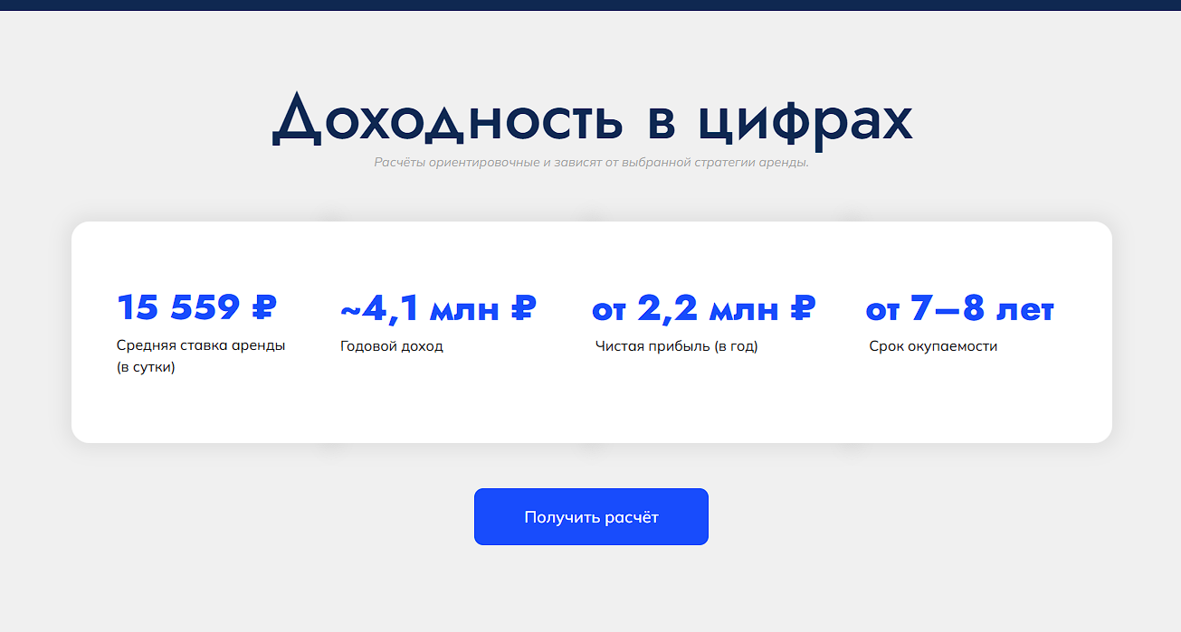 Теперь о цифрах, которые приводит застройщик. Обещание дохода в 4,1 млн рублей в год при вложениях от 2,2 млн выглядит слишком оптимистично. Даже при загрузке 67% от года и ставке 15559 рублей в сутки выручка составит около 3,8 миллиона. Из этой суммы нужно вычесть коммунальные платежи, услуги управляющей компании, налоги и амортизацию. Чистая прибыль окажется значительно ниже заявленной.