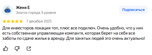 Комментариев инвесторов пока что нет, так как дома ЖК еще не построены. Первые корпуса сдадут только к 1 сентября 2027 года, а ключи владельцы получат не позднее 1 мая следующего года. На этом этапе инвестор получит пока что только договор долевого участия.Реальные отзывы о доходности появятся не раньше, чем через 2-3 года после сдачи первых корпусов. Первые жильцы и арендаторы заедут только в 2028 году, после этого УК понадобится время, чтобы наладить все процессы. Лишь спустя несколько месяцев, а то и год, можно будет собрать статистику по реальной заполняемости, среднему чеку аренды и прибыли.
