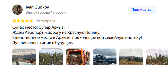 Также люди высоко оценивают инвестиционную привлекательность проекта. Они отмечают рост цен на недвижимость в Архызе за последние годы, высокий спрос на аренду и круглогодичный турпоток. Несколько человек написали, что цены на жилье в этом районе выросли втрое за год.