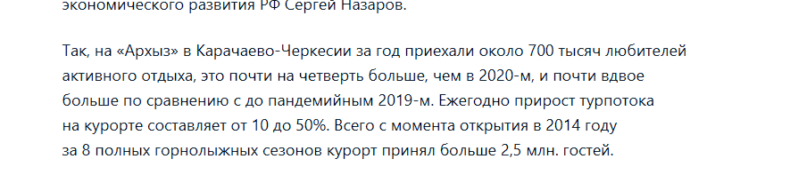 Фрагмент статьи независимого ресурса, который подтверждает прирост турпотока в Карачаево-Черкесии. В течение 5 лет там еще построят аэропорт и проложат дорогу Архыз-Сочи, что наверняка усилит тенденцию.