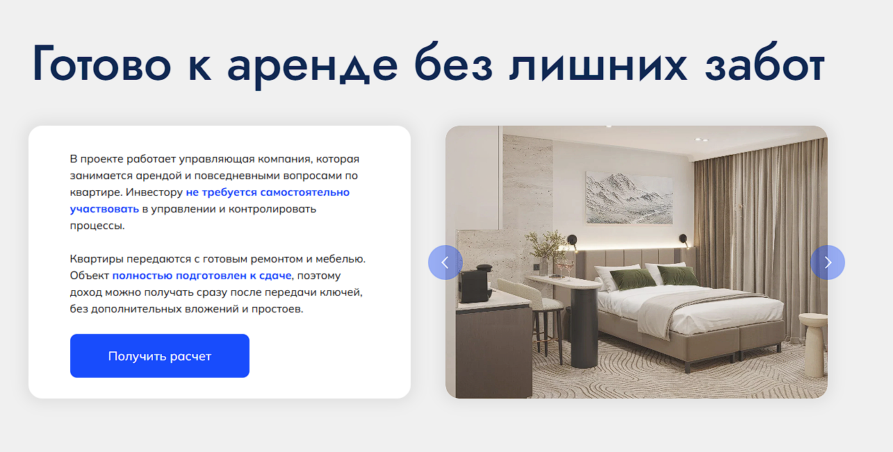 Квартиры в ЖК «Горы здесь» передают готовыми, с ремонтом и мебелью, и сдавать их можно сразу после получения. Дополнительных вложений, утверждает застройщик, не нужно, следить за процессом тоже – все вопросы будет решать управляющая компания. Она сама найдет и заселит гостей, возьмет на себя обслуживание квартиры.