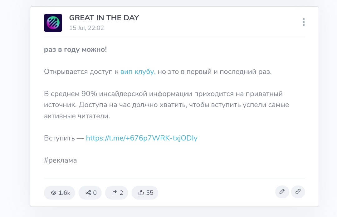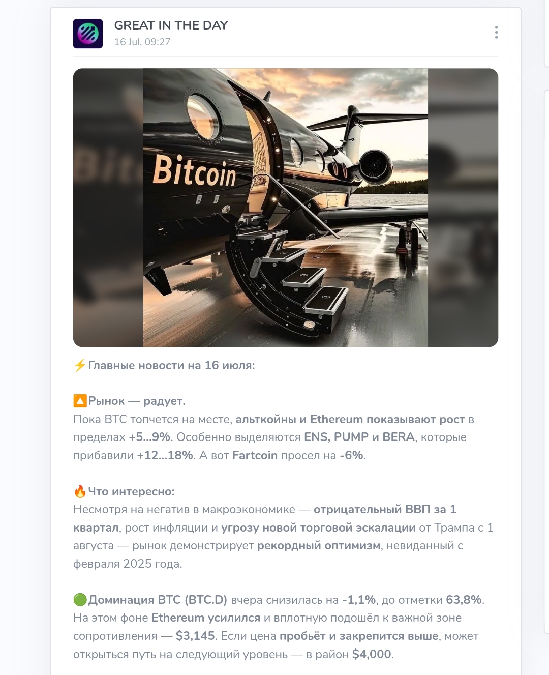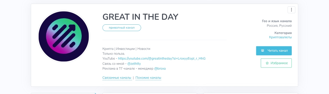 Канал GreatInTheDay собирает новости по криптовалютам, делится аналитикой и важными событиями с рынка. Админом выступает опытный участник криптосообщества под ником Zethtty, а дополнительный контакт — Broxa. В июле 2025 у телеграм-канала Great In The Day около 4 531 подписчиков, и их число растёт. Основной язык — русский, а аудитория в основном из России.