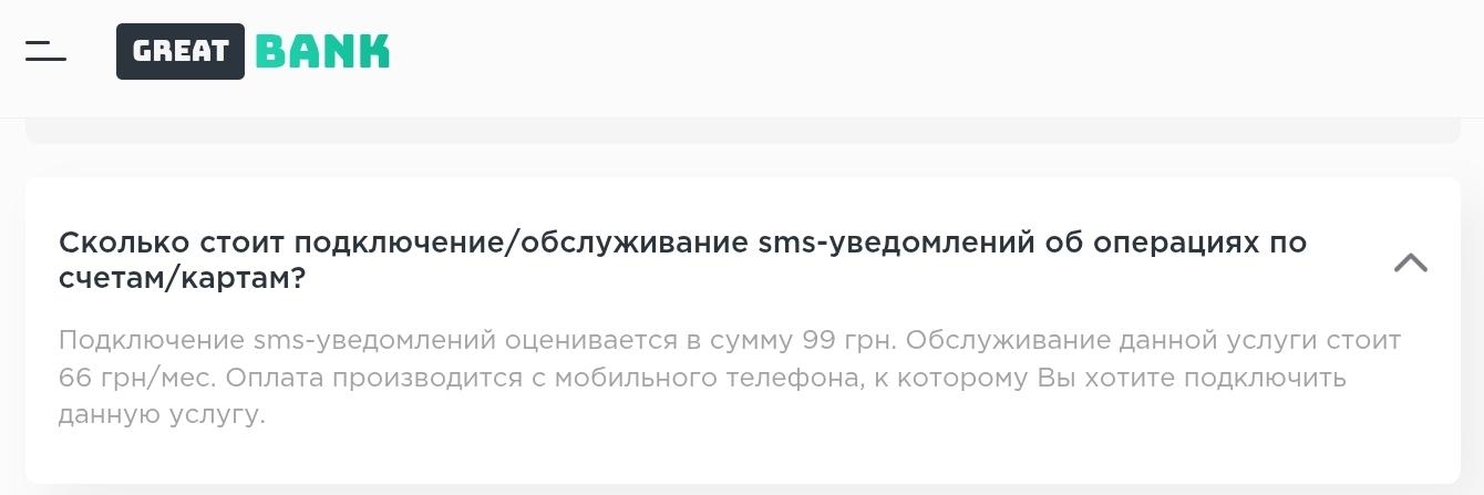 В разделе вопросов и ответов написано о подключении СМС-уведомлений за 99 гривен, а ежемесячный платеж составит 66 гривен. Обслуживание счета бесплатное.