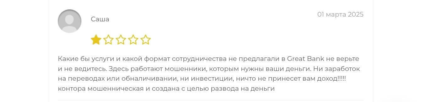 На сайте «Вся правда» есть 3 отрицательных отзыва о Great Bank. Пользователи пишут, что конторе нельзя доверять, так как сайт принадлежит мошенникам. Некоторые утверждают, что лишились средств во время сотрудничества с проектом.