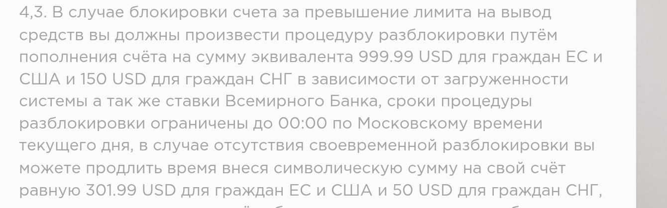 В Пользовательском соглашении написано о нескольких видах дополнительных оплат. Например, чтобы разблокировать счет на Great Bank, который заморозили из-за превышения лимита на вывод, требуется заплатить от 150 до 1000 долларов. Причем сделать это нужно до конца суток по Московскому времени. Для продления срока просят 50 или 302 доллара в зависимости от местоположения клиента. Выглядит это подозрительно.