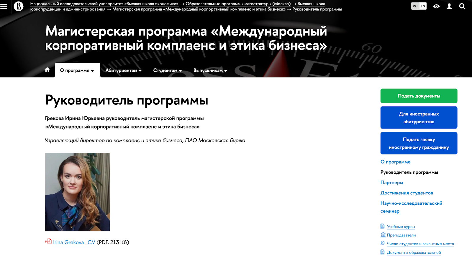 На официальных страницах ВШЭ Грекова Ирина указана как директор института и научный руководитель программы. Есть упоминание роли в Московской бирже и опыте управления комплаенс-процессами. Состав преподавателей включает академиков и практиков — юристы, комплаенс-офицеры, эксперты по этике и представителями финансовых организаций.