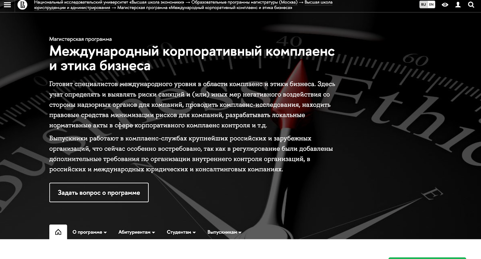 Среди списка дисциплин — международное и банковское право, антикоррупционный комплаенс, внутренний контроль, управление этикой, противодействие отмыванию денег, комплаенс в области персональных данных и рыночных манипуляций. Акцент сделан на регуляторике и практических инструментах — разработка политик, алгоритмы расследований, дизайн контроля, подготовка регуляторных отчетов.Практическая насыщенность коррелирует с приглашенными лекторам, в описании фигурируют эксперты с реального рынка и представители регуляторов. При этом точно ознакомиться с часовыми нагрузками по отдельным дисциплинам можно только по официальному учебному плану — там указаны обязательные модули, элективы и требования к выпускной работе.