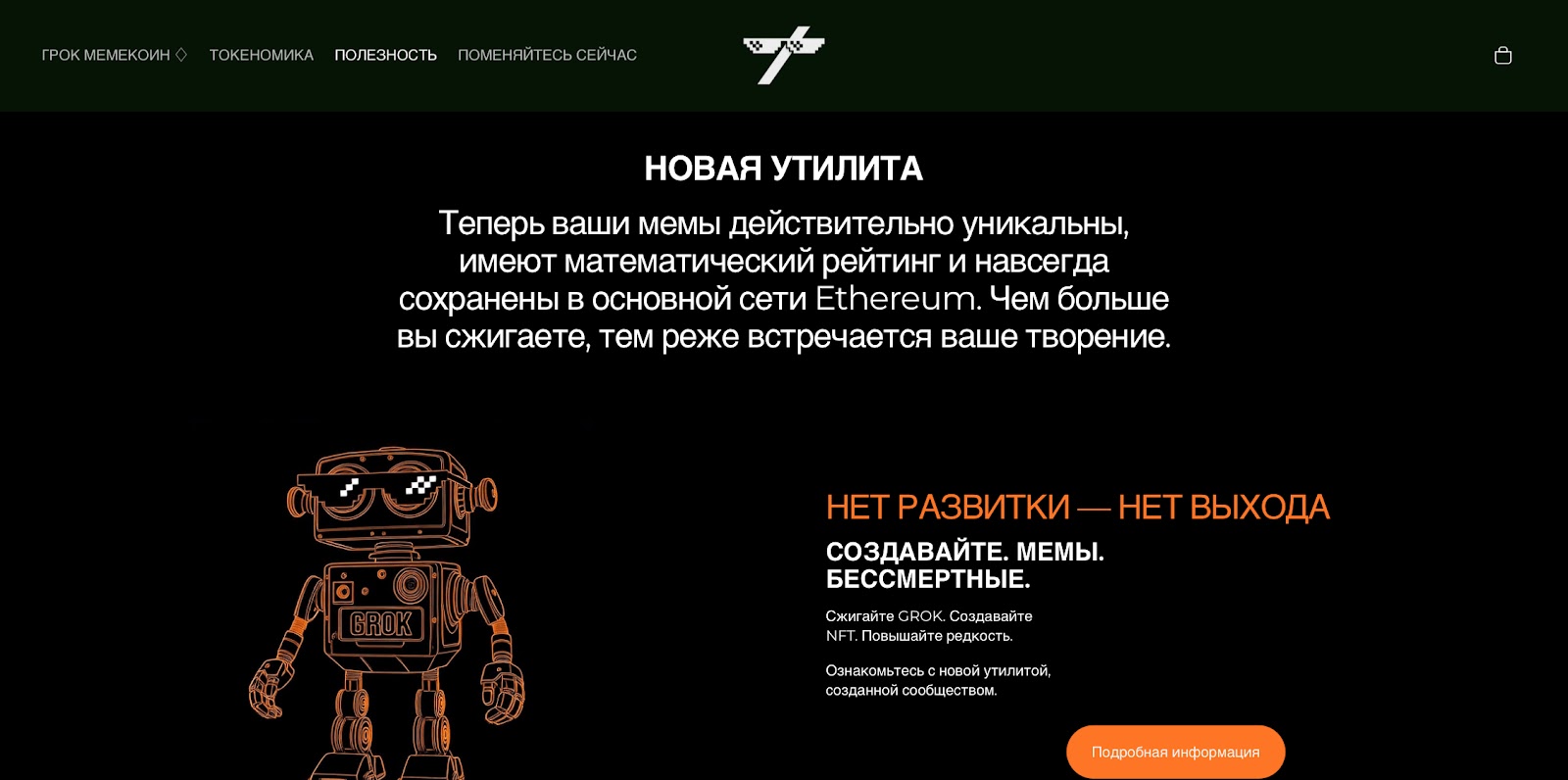 Криптовалюта «Грок» связана с генерацией НФТ. На базе монеты можно создавать картинки. При этом их уникальность будет поддерживаться сжиганием монет. Все мемы имеют математический рейтинг и сохраняются в сети Эфириум. Если пользователь сжигает больше — его мем встречается реже и становится уникальнее.