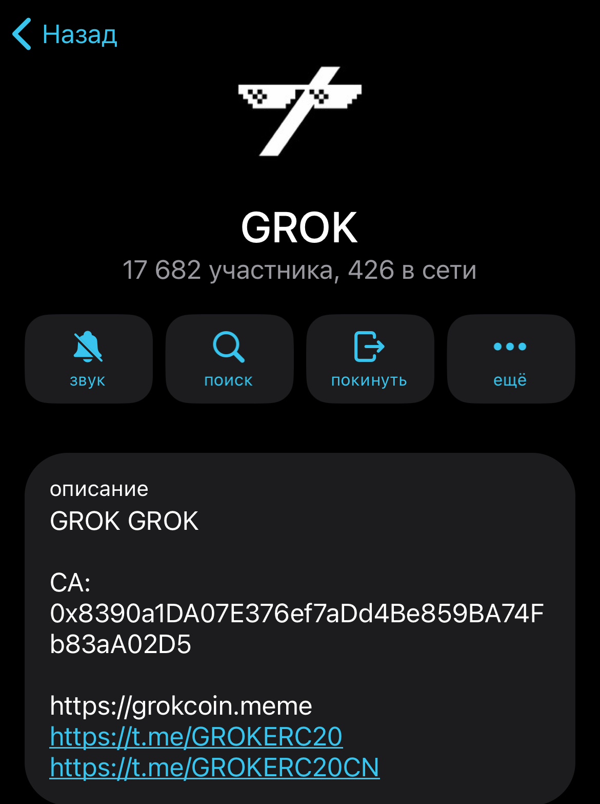 На сайте есть ссылки на телеграм каналы — GROKERC20 и GROKCTOETH, он же GROK CTO. Первый канал — прокладка между реальным сообществом и ботом для верификации. После подтверждения можно зайти в паблик. Подписано 17 682 человека, при этом формат — групповой чат, где писать могут только админы.