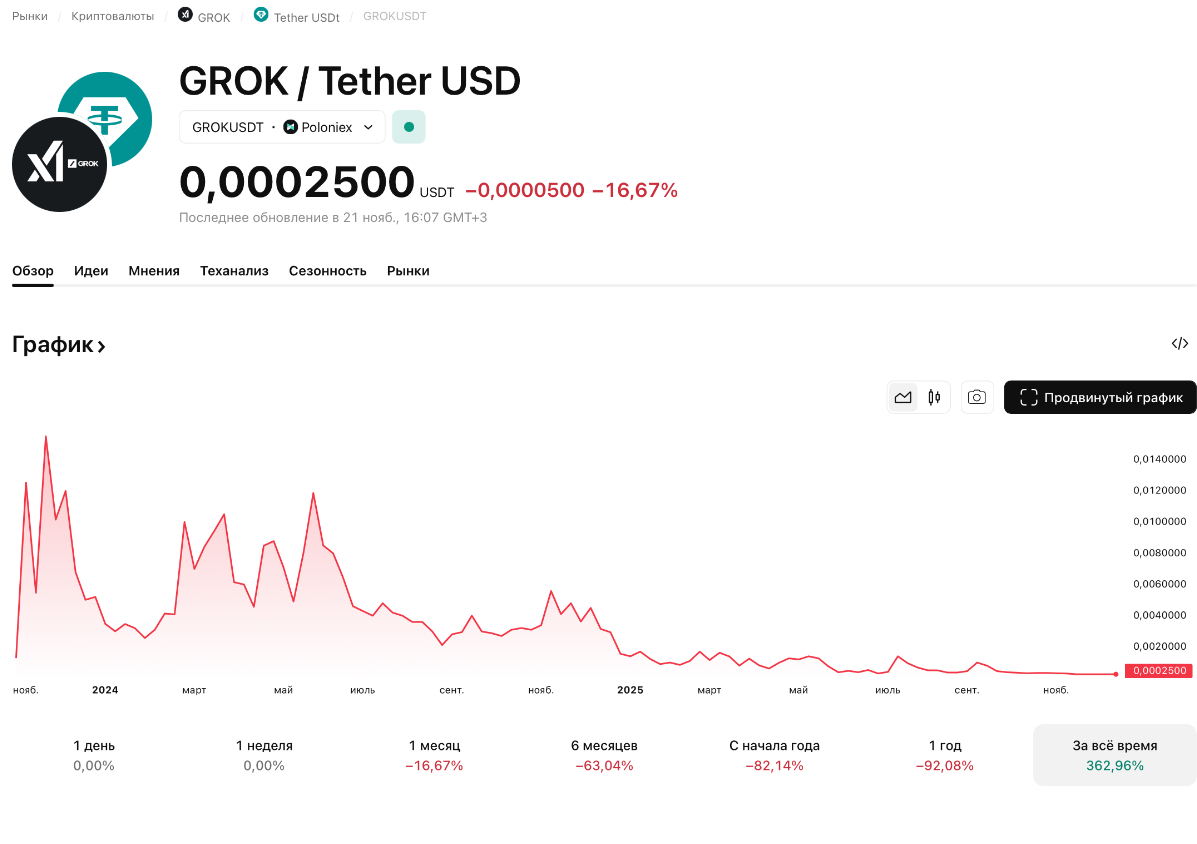 Монета есть на TradingView. Указано, что текущая стоимость — 0,0002500 USDT. При этом с ноября цена только снижалась. Если проследить все время оборота, мы увидим, что глобально цена выросла на 362,96%, что показывает неплохой результата в долгосрочной перспективе. Сколько токенов Grok — сайт отражает то же количество, что и на сайте.Возможности стейкать монету нет. Никаких манипуляций с ней сделать не получится. Единственное — купить с ожиданием роста цены.