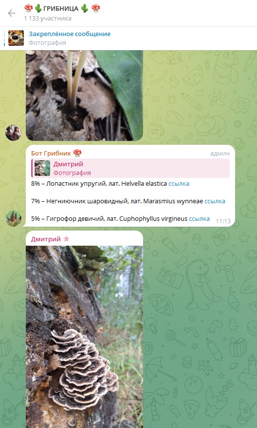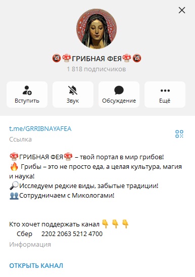 В телеграм-канале gribnajafea под названием «Грибница» состоит чуть более тысячи участников. Администратор канала Дмитрий публикует информацию о различных видах грибов с научными названиями, однако активность в чате остается низкой.