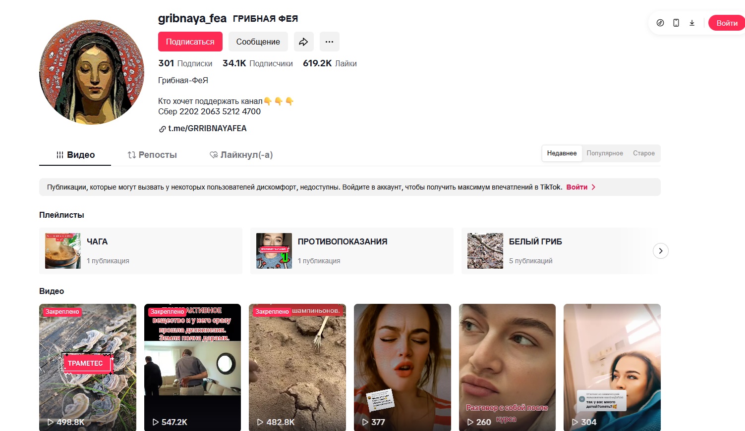 В TikTok-канале @grribnaya fea собралось более 340 тысяч подписчиков. Некоторые видео набирают сотни тысяч просмотров, однако большинство публикаций остаются без внимания, что вызывает вопросы о реальной популярности канала.