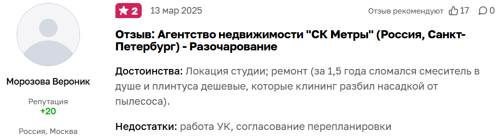 Отзывов обычных людей о компании «Метры» в Санкт-Петербурге в интернете удалось найти не так много. Это выглядит сомнительно, учитывая достаточно большой срок работы агентства. Один из авторов отзыва о ГК «Метры» отмечает, что недоволен качеством объекта, который он купил. Аферисты даже не согласовали перепланировку перед продажей квартиры.