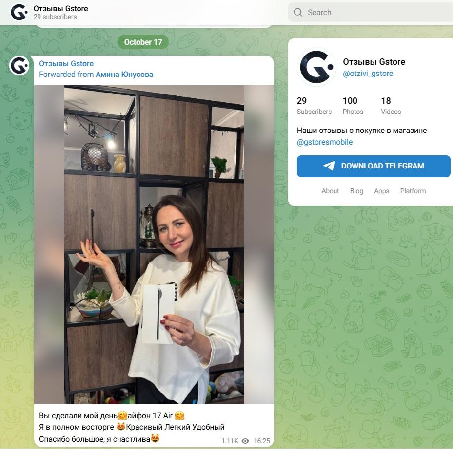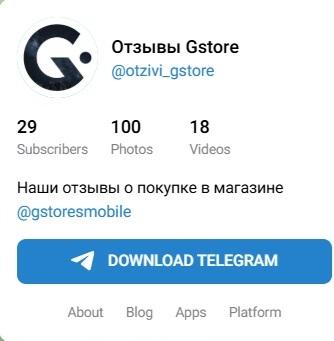 Основной канал GStore Mobile @gstoresmobile в Telegram не работает. При попытке зайти туда появляется ошибка. Вероятно, канал удалили или заблокировали. Остался только канал с отзывами «Отзывы Ostore» @otzivi gstore. В нем всего 29 подписчиков, хотя опубликовано 100 фото и 18 видеоотзывов.