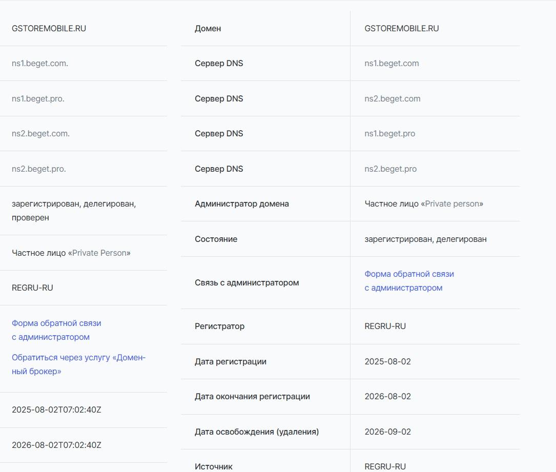 Проверка данных о GStore Mobile не выявила публичной информации о юридическом лице. Владелец домена указан как частное лицо, что не соответствует стандартной практике для розничной торговли.