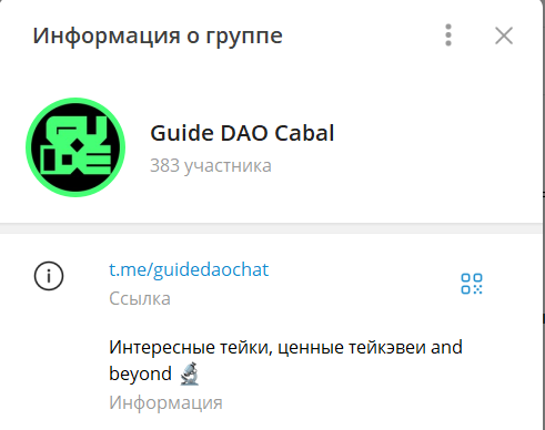 В закрытый чат Guidedaochat можно попасть только после одобрения заявки. Канал в телеграмме Guide DAO Cabal предназначен для участников школьного комьюнити.