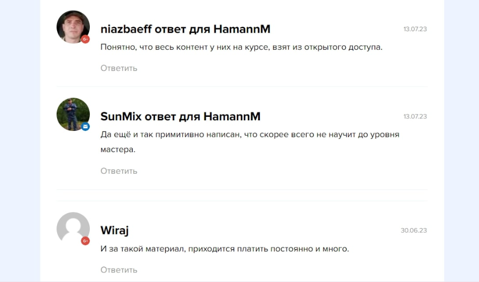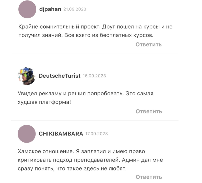 - Пользователи отмечают, что программа курсов не эксклюзивная, а скопирована из бесплатных источников — вы зря потратите деньги, покупая некачественное обучение.