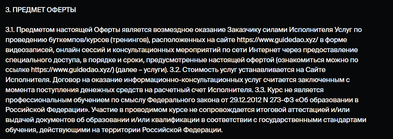 - В школе Guidedao вам обещают выдать NFT-диплом, а в оферте сказано, что документов о получении профессии данная образовательная организация не выдает. На основании оферты по окончанию курсов вы не получите никакого диплома.