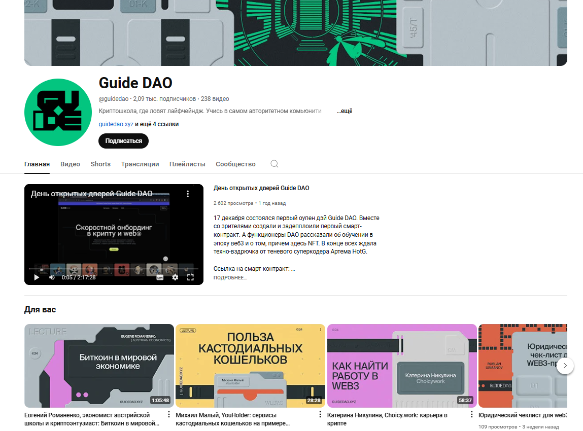 Нам не предоставляют информации о квалификации учителей, да и сам формат учебных трансляций, часть которых выложена в YouTube на канале Guide DAO неудобен для восприятия. Нет ощущения стройной и логичной системы обучения.