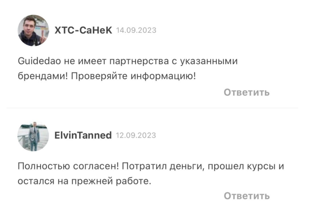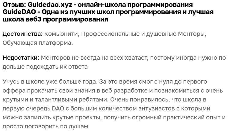 В сети много положительных отзывов о Guide dao: мы предполагаем, что они — часть рекламной кампании, предпринятой для привлечения учеников. К отзыву приложен чек оплаты за обучение, что неестественно для обычного отклика в сети.