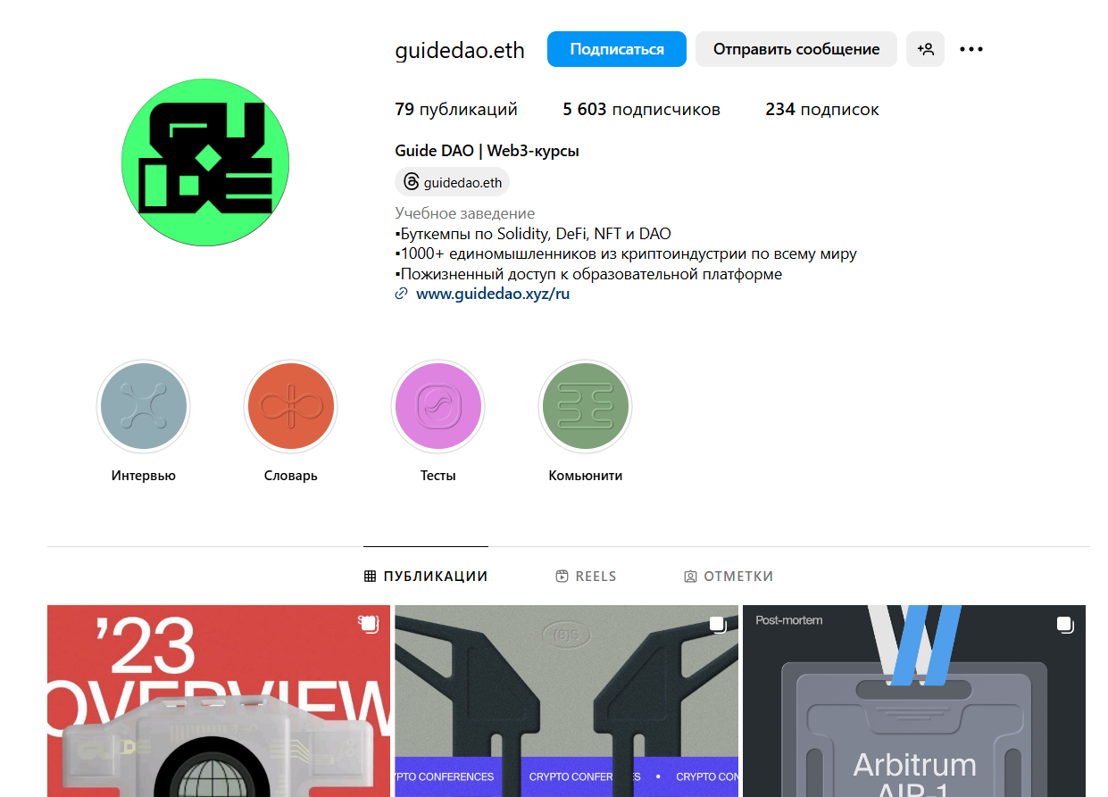 Информационную поддержку организаторы проекта Guidedao осуществляют в YouTube, публикуя на площадке видео и транслируя стримы на темы крипты. Все материалы носят разрозненный характер и образуют системы.Про публикации в Инстаграме в аккаунте Guidedao eth можно сказать то же самое: они разрозненны и не вызывают интереса подписчиков.