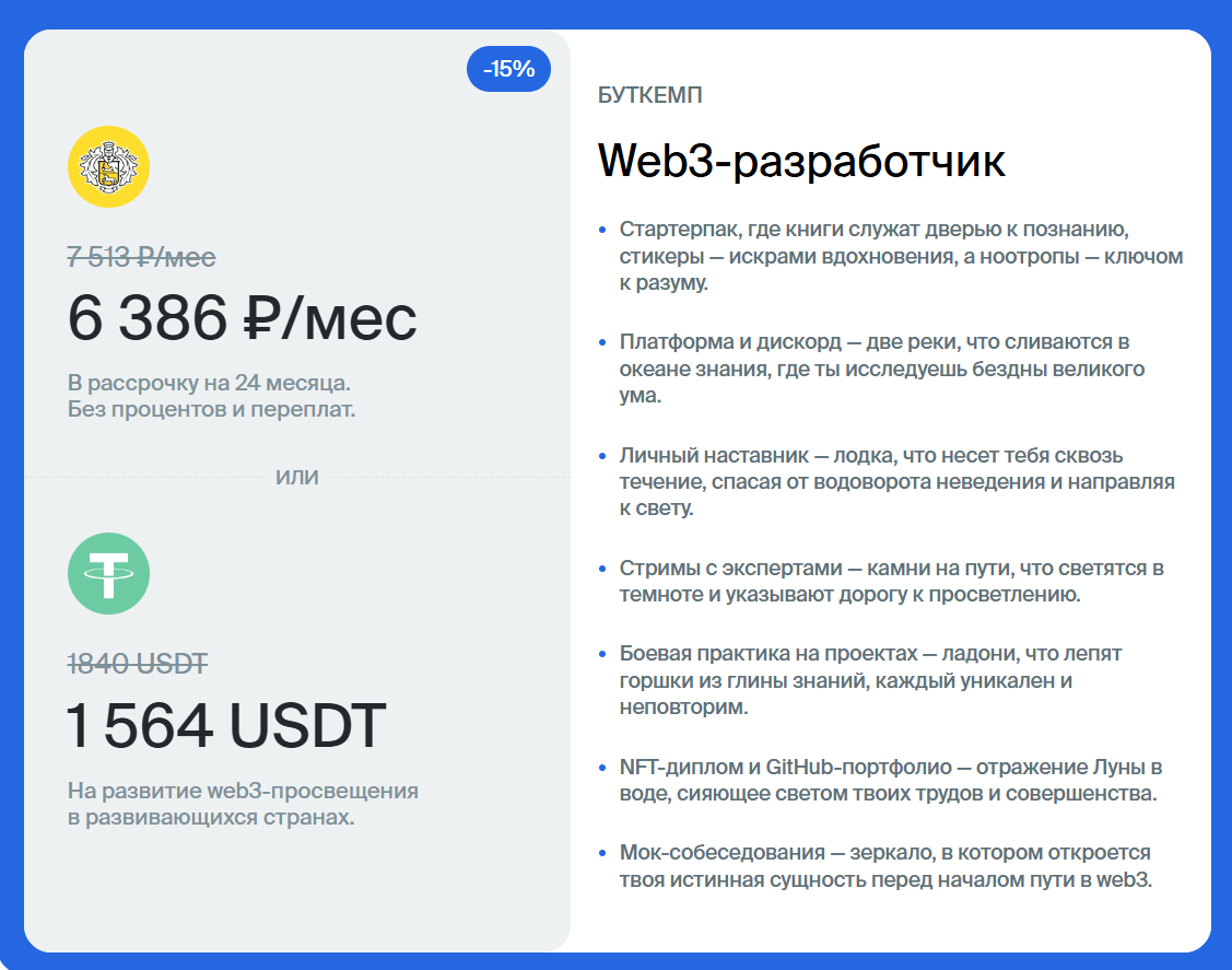 Специальность Web3 разработчика придется осваивать 6 месяцев, заплатив 6386 руб/мес.