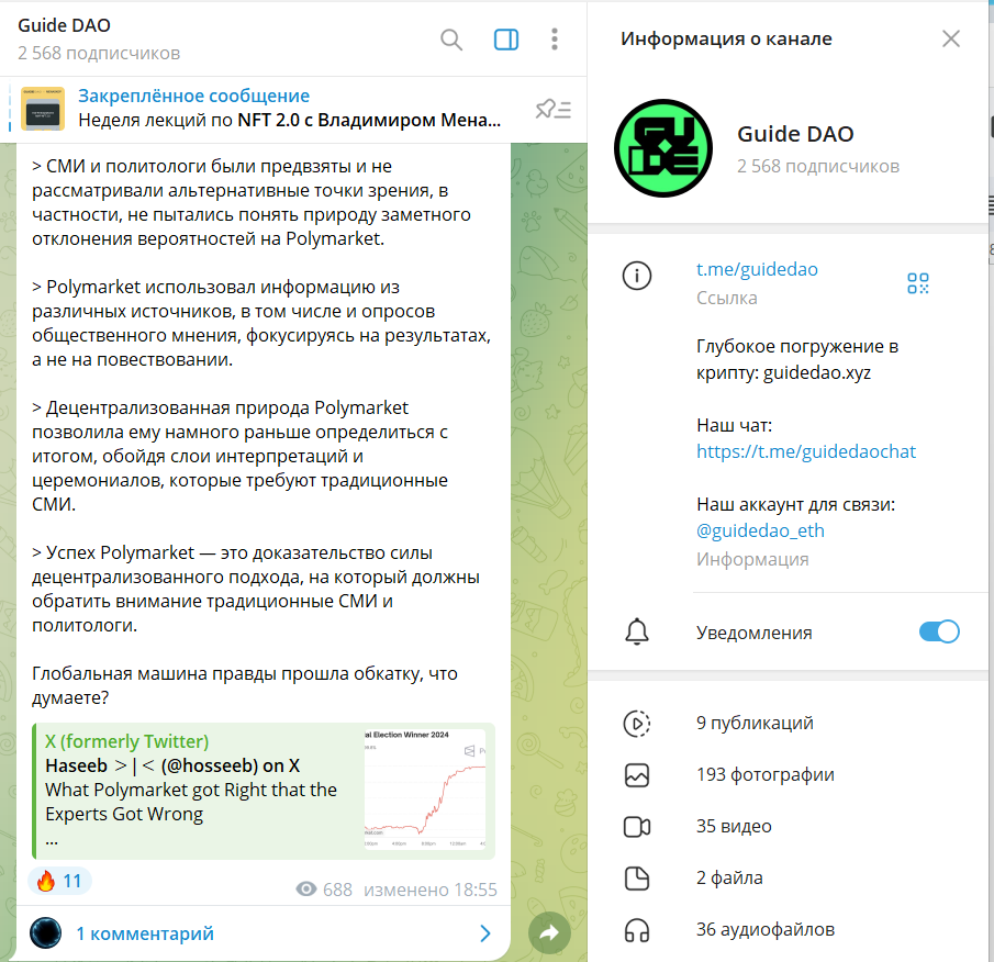 В телеграмм-канале Guide DAO создается иллюзия погруженности в тему крипто-разработки, публикуются новости из этой сферы. Однако 2568 подписчиков мало реагируют на посты и не оставляют комментариев.