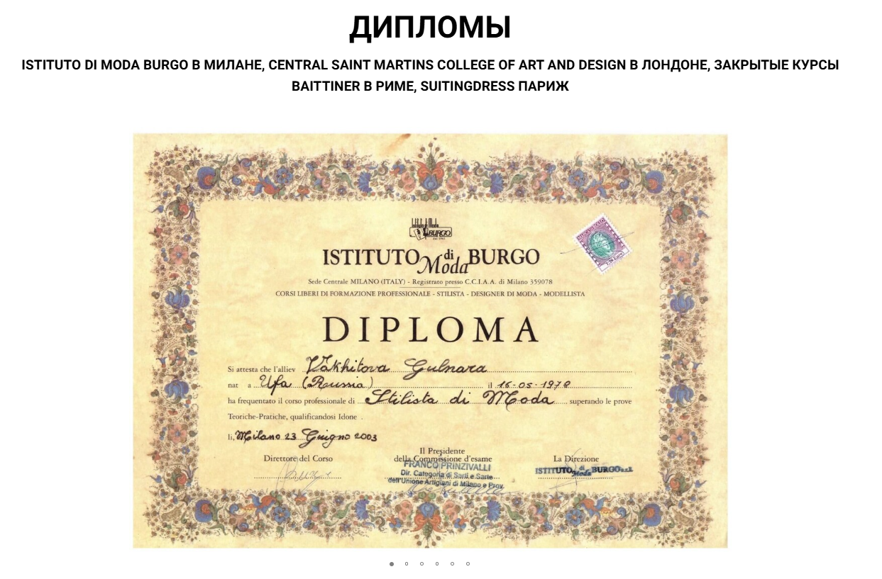 На официальном сайте модельера Edu fashionacademy one указывается, что она училась в Лондоне и Милане. Теперь Гульнара ведет свои задания по западным методикам в РФ. Ранее автор работала по другой специальности, но хотела стать модельером и накопила деньги для поездки на учебу в Милан. Потом продолжила свое обучение в Лондоне и теперь сама уже преподает. У нее есть документы об окончании различных мастер-классов. Ее детская коллекция одежды оказалась достаточно успешной.