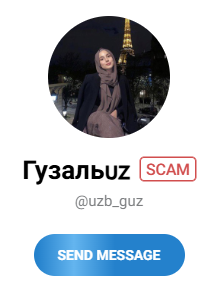 Адрес Uzb Guz ведет не в классический канал, а принадлежит пользователю Телеграмм. Обращает на себя внимание, что мессенджер пометил его значком SCAM. Это значит, что на человека поступило много жалоб от разных юзеров, которые утверждают, что их обманули. Однако у нас нет возможности узнать, что именно предлагала данная девушка ранее. Скорее всего, она вела какое-то Telegram-сообщество, затем свернула проект, но не успела избежать жалоб на свою работу.